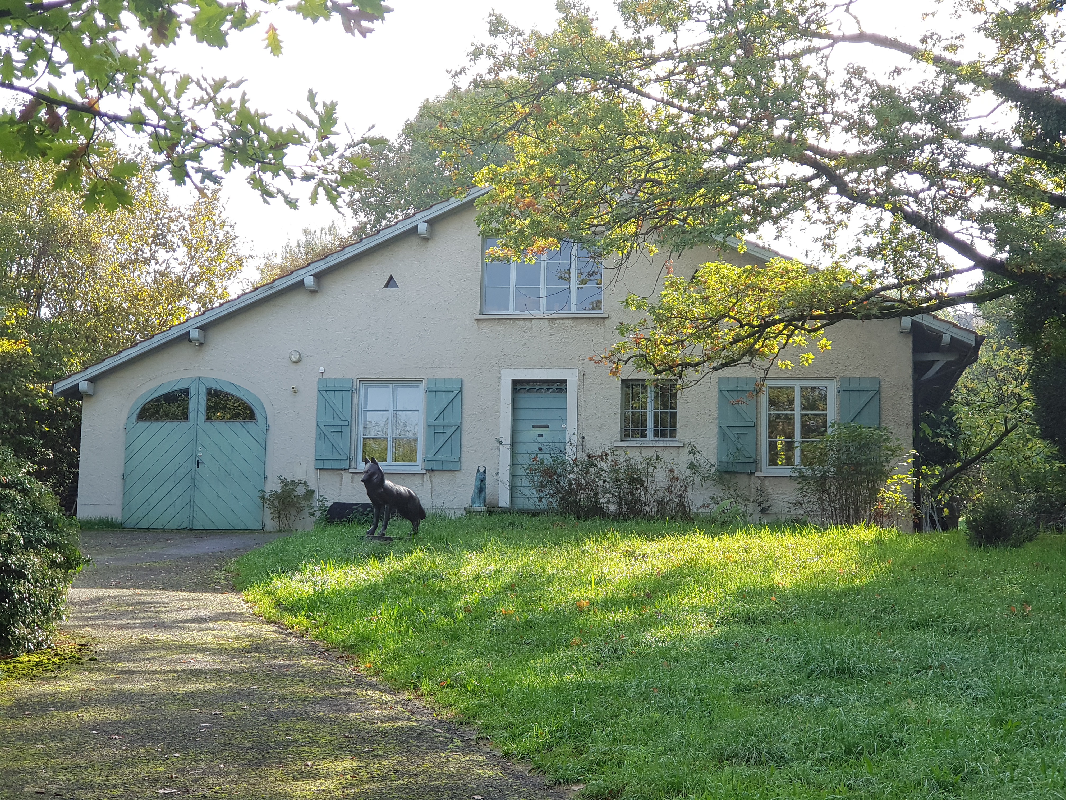 D’abord, on n’aperçoit pas la maison. Elle est cachée dans les arbres, sans être véritablement isolée des habitations voisines, car un petit immeuble est venu se construire à proximité. La densification du bâti l’a enserrée dans les années 50-60. Une maison d’aspect assez quelconque, en aucun cas une riche villa de parvenu comme on en voit tant autour de Genève, sur les hauteurs de Cologny ou de Veyrier. Une maison, dessinée par Germaine Hainard (1902-1990). Une maison qui parle au visiteur d’un autre temps, peut-être d’un temps arrêté, mais une maison à mesure humaine.