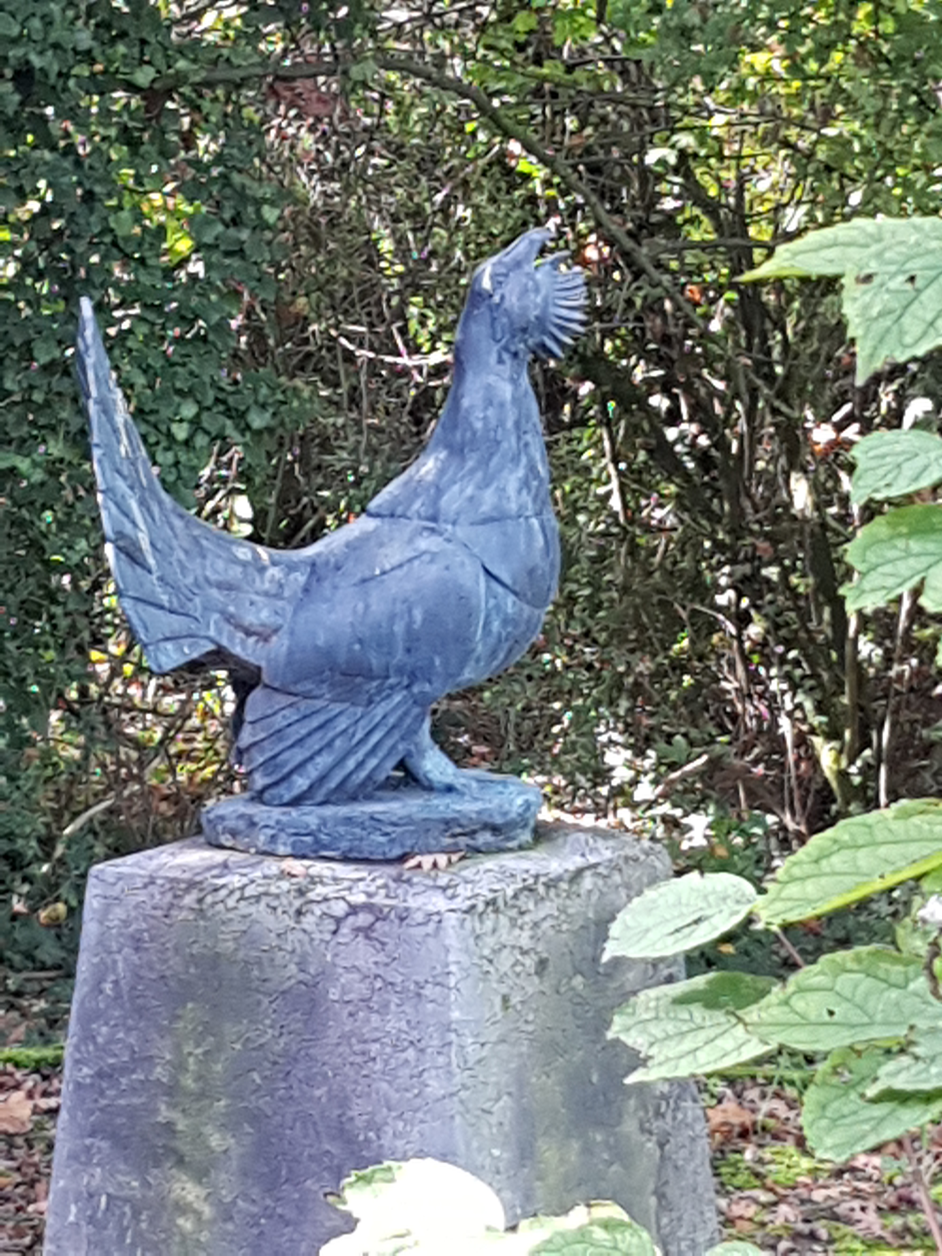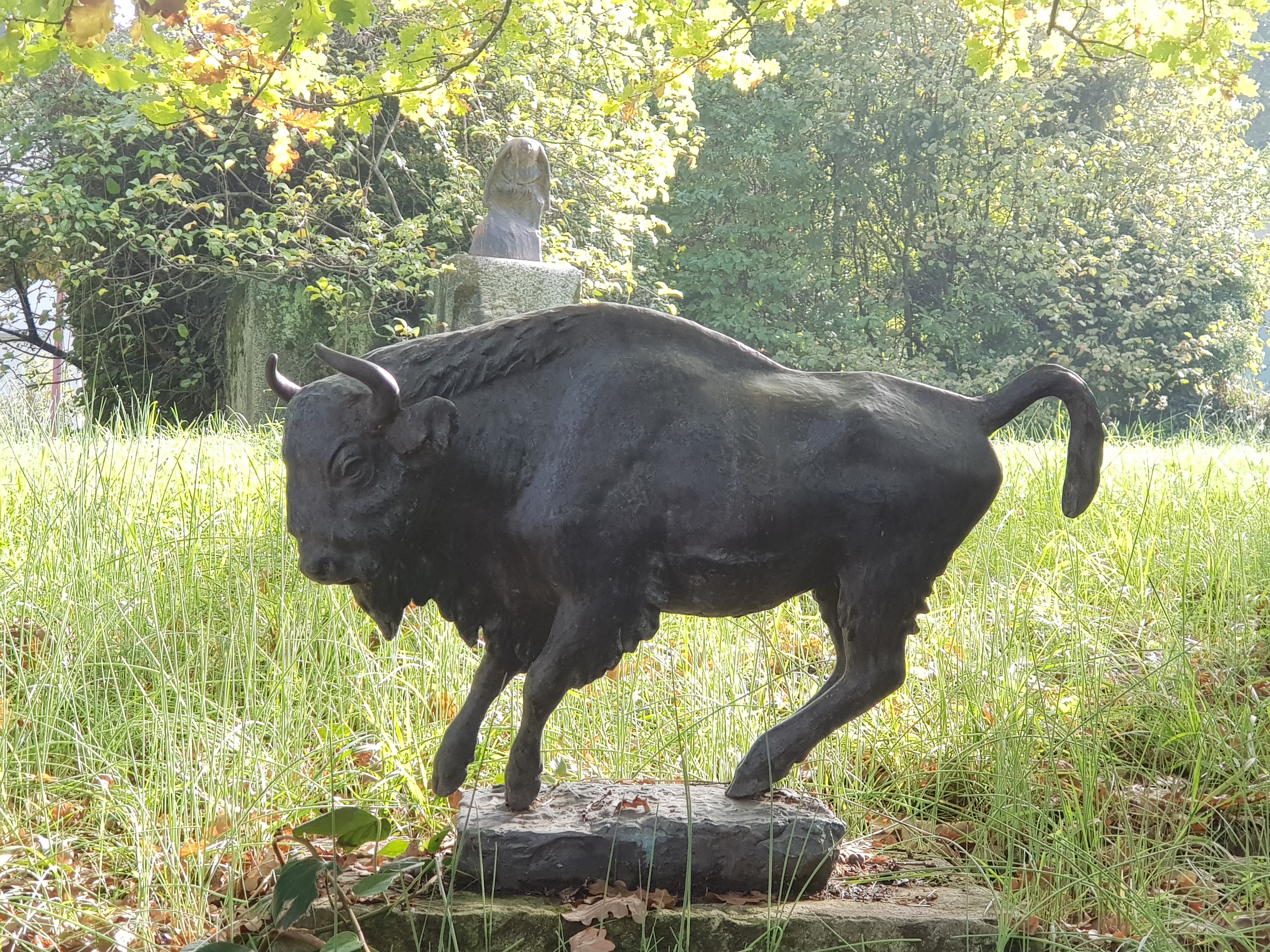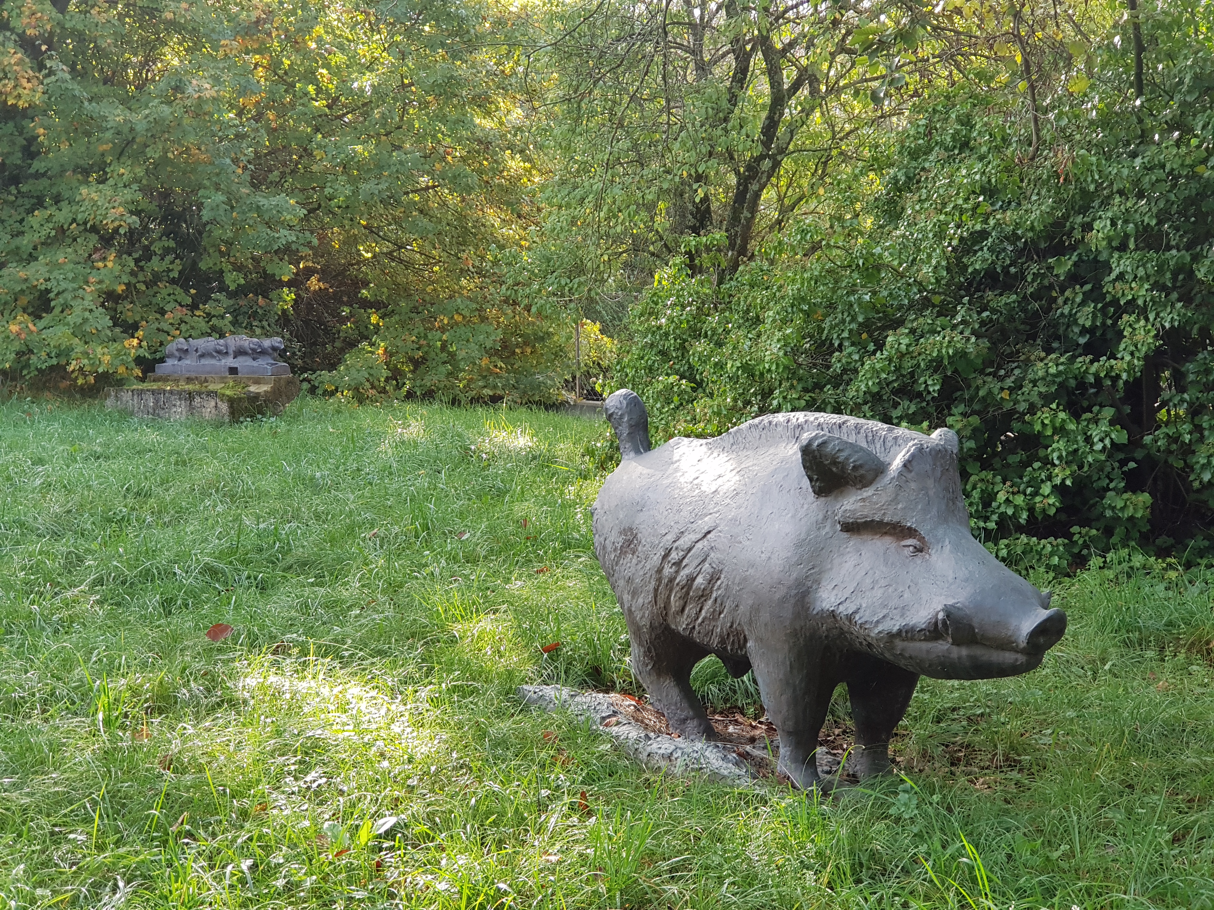 Des sculptures sont disséminées dans le jardin. Elles accueillent, chacune à sa manière. La loutre presque cachée, un bison bondissant, une laie suivie par sa troupe de marcassins empressés, un grand tétra chantant, un loup tranquille et digne, proche de l’entrée de la demeure veille un lynx aussi fier qu’attentif. Avant même de mieux connaître l’art de Robert Hainard (1906-1999), ces œuvres témoignent au visiteur une volonté de restituer la noblesse, la force dont chaque animal détient le secret, et dont il montre la perfection. Chacun selon sa nature, soigneusement observée sur le vif. Le visiteur le ressent, ces animaux ne sont pas les illustrations chics d’un catalogue de décoration.