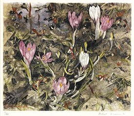 Sommes-nous en fait chez un luthier, un ébéniste ? L’atelier du graveur renforce cette impression d’artisanat savant. Un atelier, le mot exact pour désigner cet espace réduit où s’entassent (mais bien rangés !) outils, essais, encres, papier, copeaux et planches. Une presse encombre et l’on comprend vite que cette masse sombre est indispensable à l’alchimie qui trouve ici son cadre. L’artiste a choisi en effet pour technique la gravure sur bois, mais en couleurs, parfois quatorze ! Par ce procédé original inventé dès 1924, le graveur doit sculpter des planches différentes, à partir d’un même croquis préliminaire, en apportant sur chaque planche les réserves, variantes et détails propres à chacune des couleurs choisies.